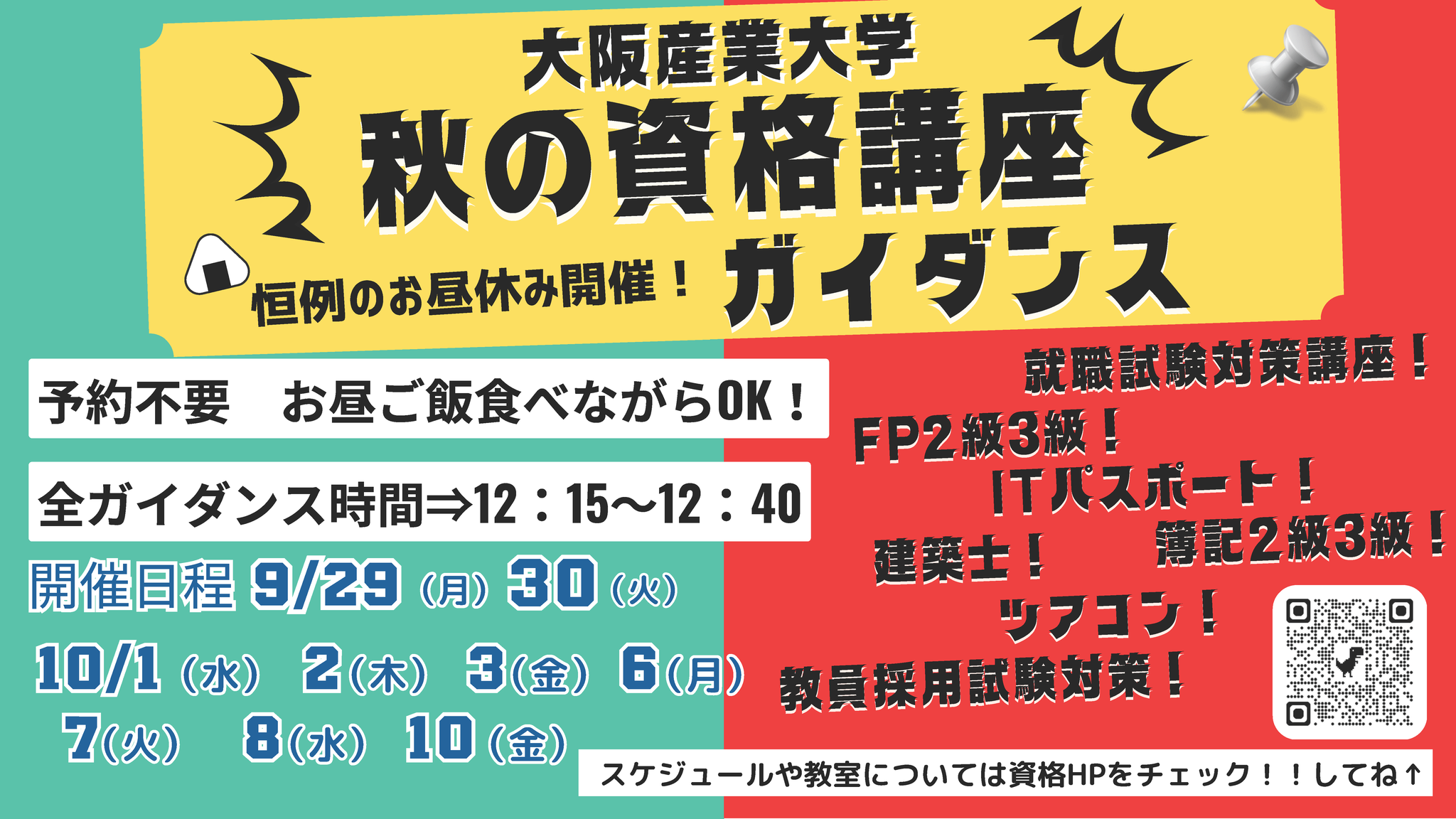 9/29(月)~10/10(金)の期間、お昼休みに後期資格講座ガイダンスを開催します!!